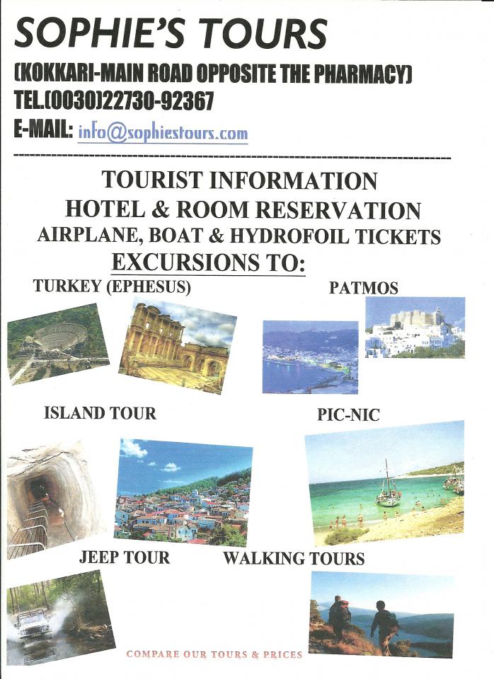 Όσο για το γραφείο μας προσφει ταξίδια στην Έφεσσο (Τουρκία), Πάτμο, γύρω του νησιού, πικ νικ σε διάφορες παραλίες και jeep για να εξερευνησετε το νησί οδικώς!!!